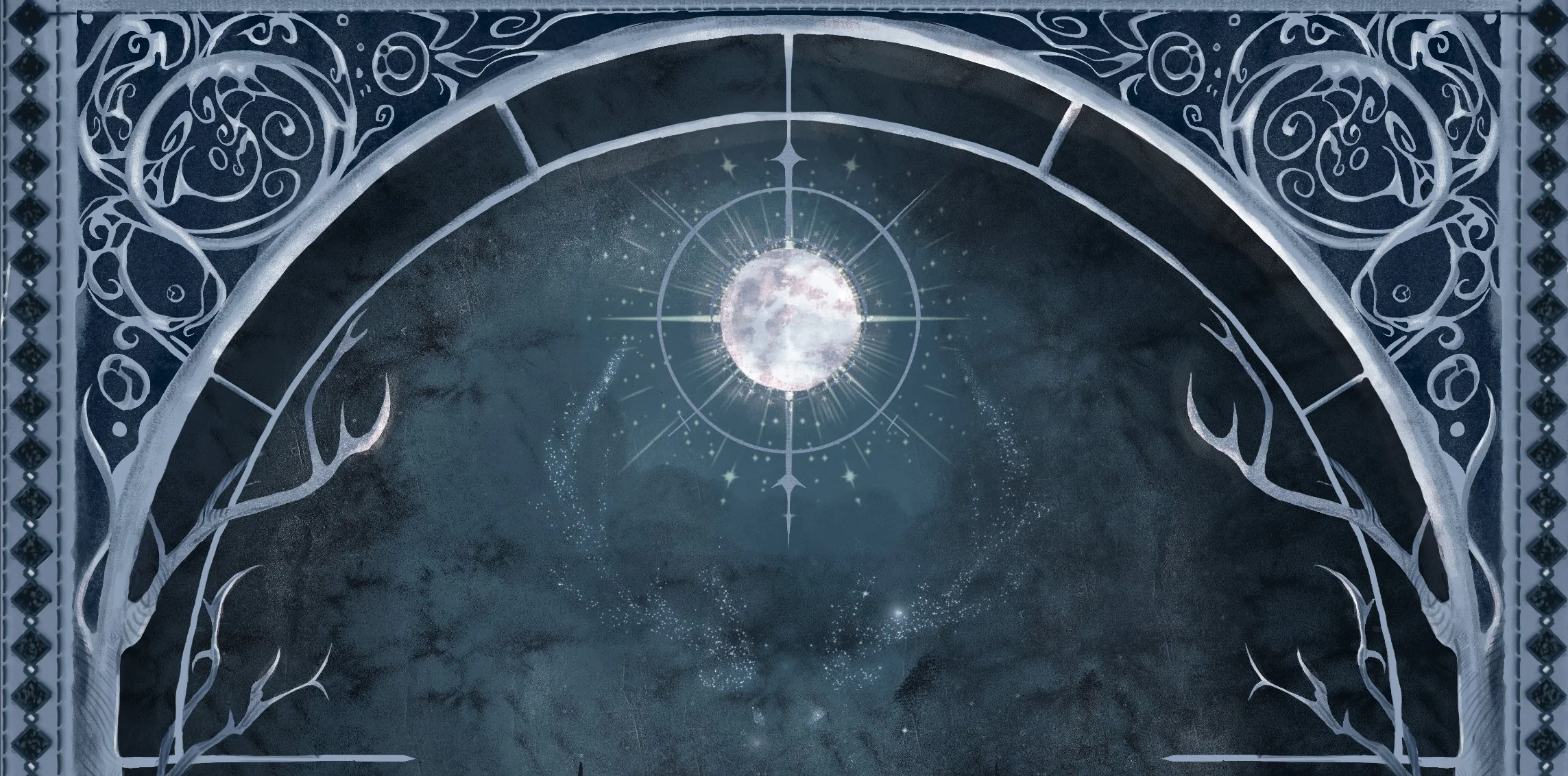In this collection, those anchors are the stag, the moon, bare winter branches, and the Art Nouveau decorative framing. Each one carries meaning: guardianship, cycles, dormancy, structure; and each one reappears across the three pieces in different forms. Sometimes present, sometimes only suggested. Sometimes dissolved into pattern entirely.