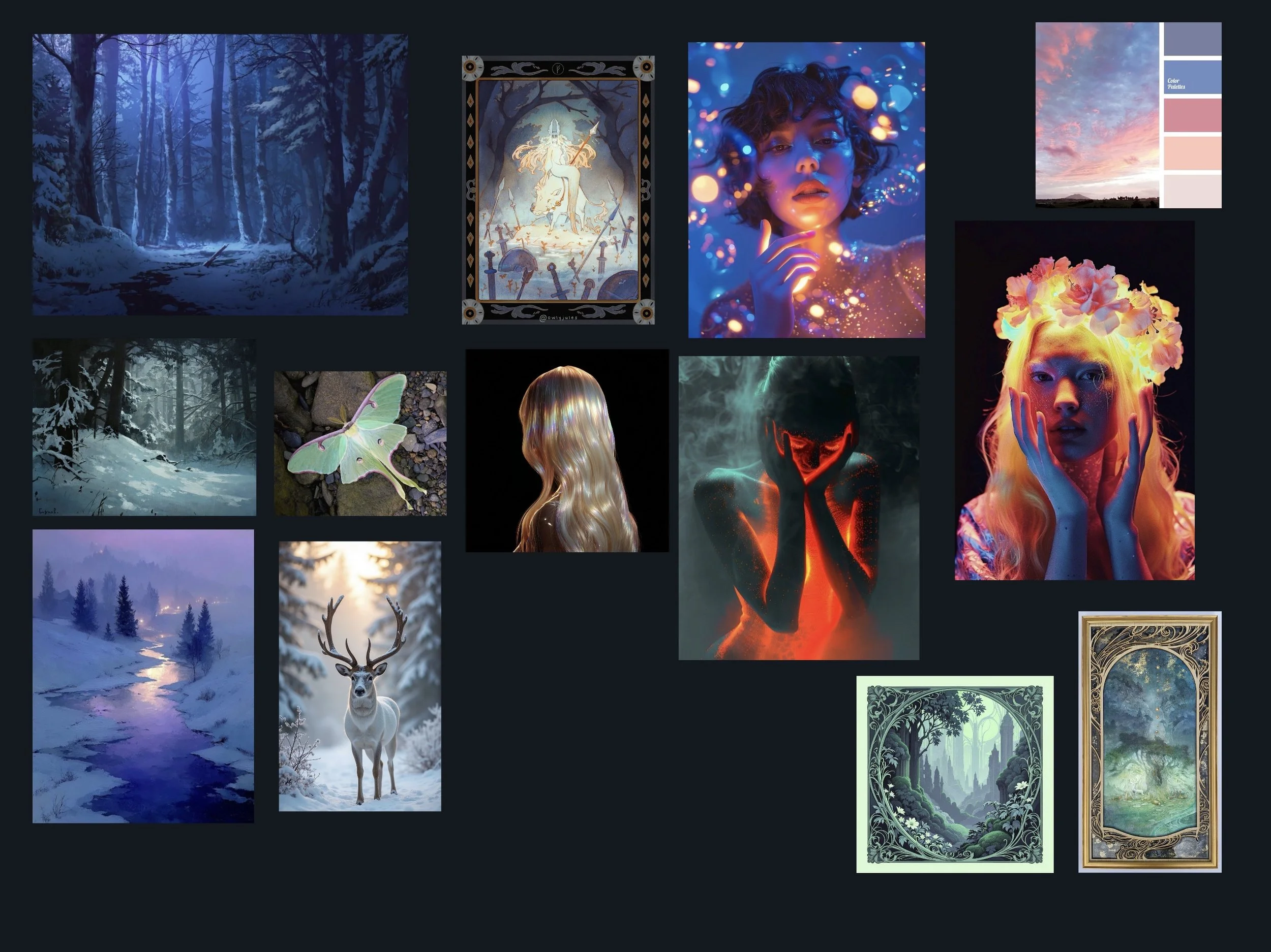 For Hibernation I wanted tones that felt still, introspective, muted, atmospheric, and a little nocturnal. Deep indigo. Cold silver. The faint amber glow of something alive beneath frost. The palette had to feel like the emotional temperature of the story itself: cool on the surface, quietly warm underneath.